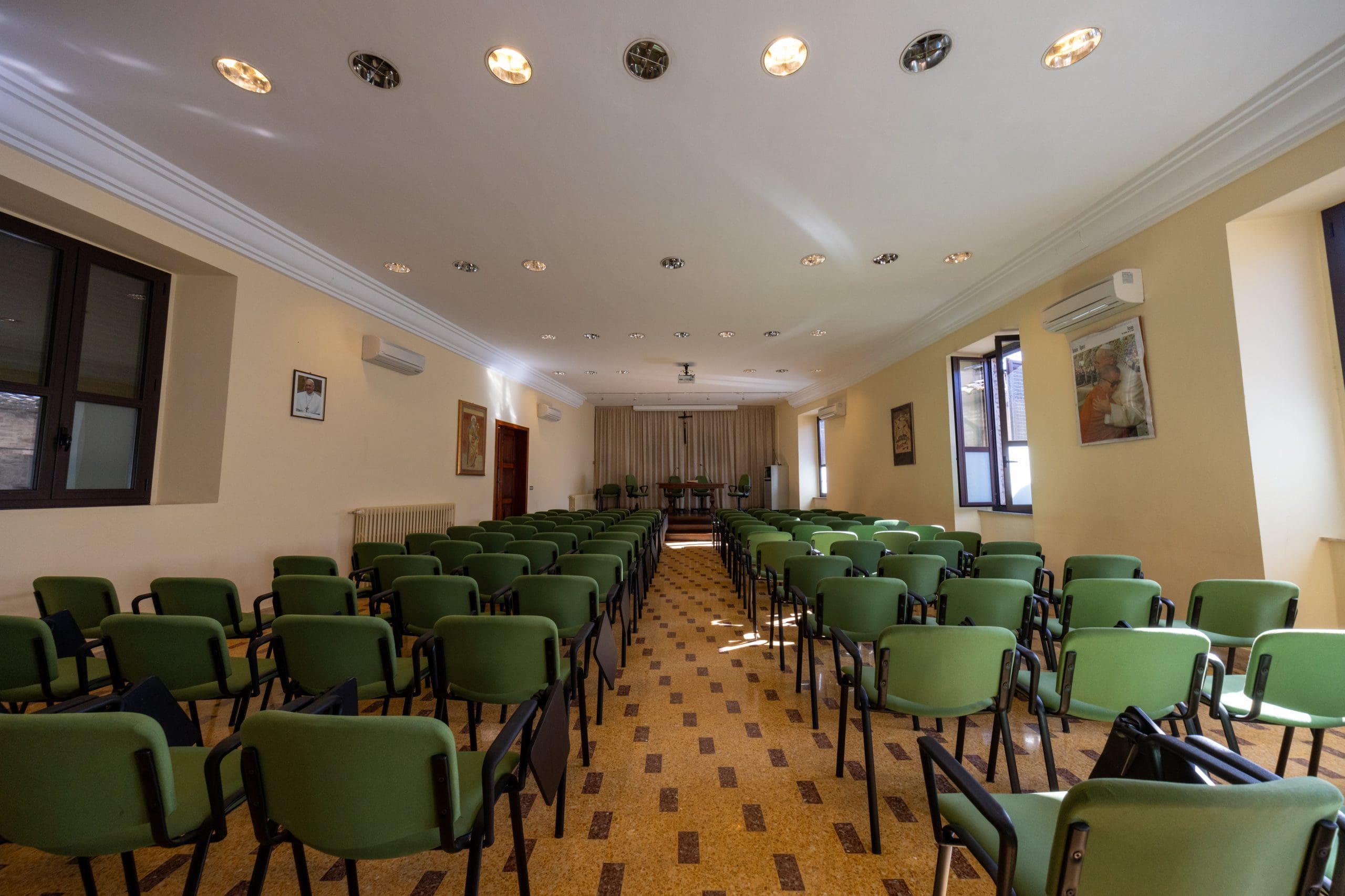 Le camere, semplici ed essenziali, sono state ristrutturate per offrire comfort moderni mantenendo intatta l’anima del luogo, con molte soluzioni adatte anche a gruppi in autogestione. Due cappelle, la sala degli affreschi dei 12 apostoli, le sale meeting e gli ampi spazi comuni permettono di alternare momenti di preghiera, condivisione e riflessione.